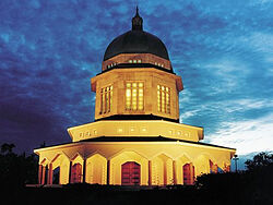 The House of Worship in Tiapapata, 8 km from Apia, Samoa was completed in 1984 and serves as the Mother Temple of the Pacific Islands. The design was by Hossein Amanat, and was dedicated by Malietoa Tanumafili II, King of Samoa (1913-2007), who was the first reigning Bahá’í monarch. Its 30 meter domed structure is open to the public for individual prayer, commemoration of Bahá’í holy days, and weekly devotional meetings. The structure is completely open to the island breezes.