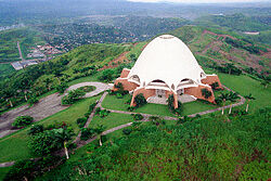 The House of Worship in Panama City, Panama was completed in 1972, and designed by Peter Tillotson[8]. It serves as the mother temple of Latin America. It is perched on a high cliff, "Cerro Sonsonate" ("Singing Hill") overlooking the city, and is constructed of local stone laid in a pattern reminiscent of Native American fabric designs. The dome is covered with thousands of small oval tiles, and the entrance gates of the temple are constructed in a unique three-dimensional design each consisting of an equilateral triangle of three vertical posts with multiple rows of bars stretching between them at various angles, each row of which gradually changes from vertical to horizontal. A notable feature of the design is that there is no glass in the doors or windows.